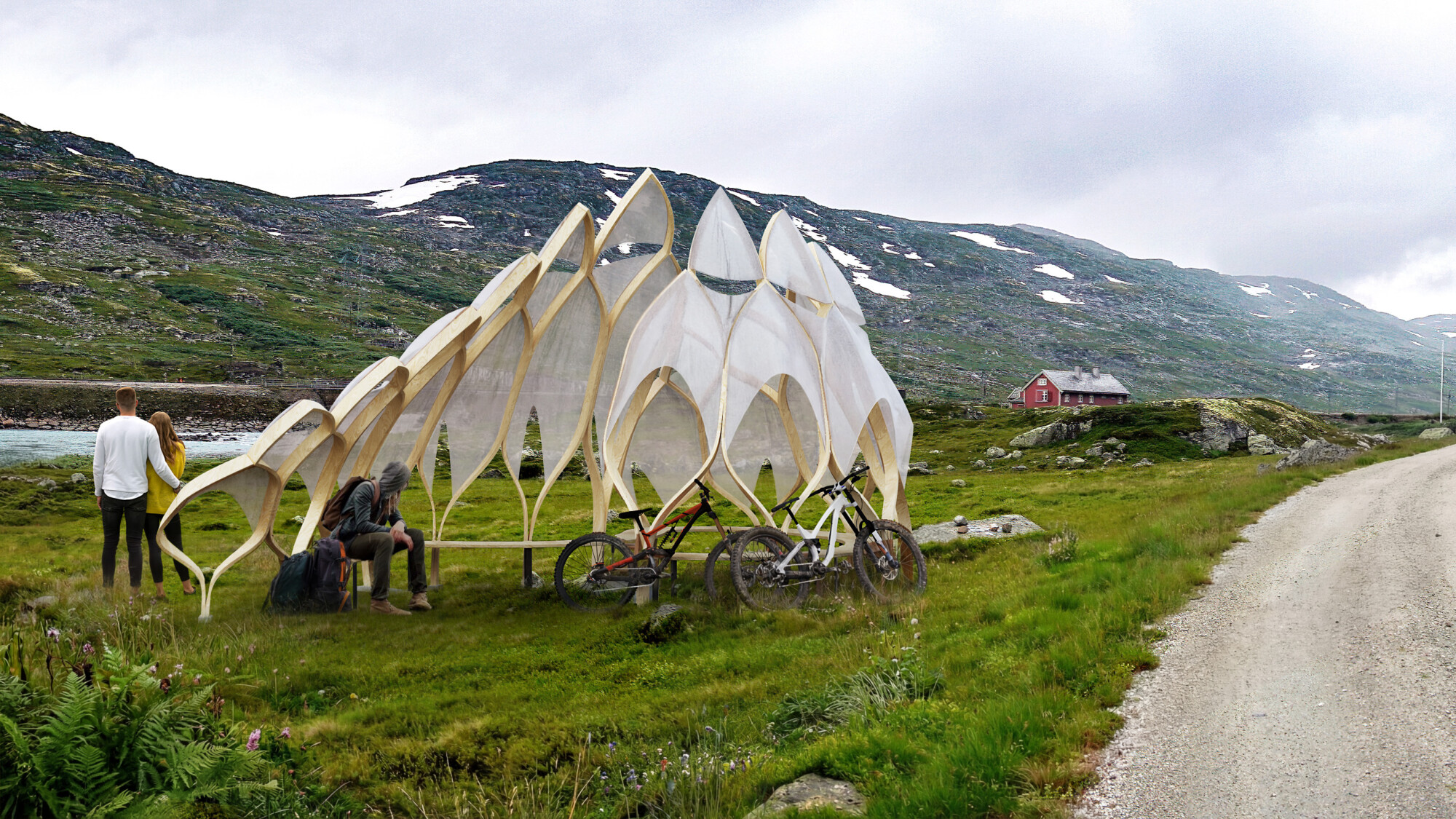 Inspired by the “Digital workflows in glued timber fabrication” workshop, the Rallarvegen Shelter takes shape from glue-laminated timber pieces bent into shape and covered with fabric. Located at the iconic Rallarvegen route, the structure acts as a resting spot and hideout place for cyclists and hikers heading towards Finse.