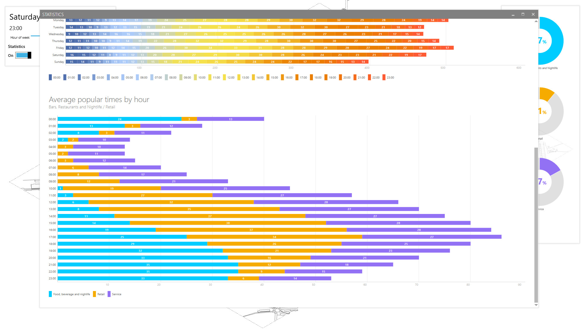 The intent of this exercise was to create an interactive dashboard using Python and Grasshopper in Rhino 3D, in order to visualise and analyse data (including popular times) from the Google Maps API. The whole process is highly automated – the python script takes a set of coordinates and gathers the data automatically. The grasshopper definition takes the same coordinates and data in CSV format from the Python scripts and generates the dashboard and graphs. Around 40 000 data points are generated for a given area.