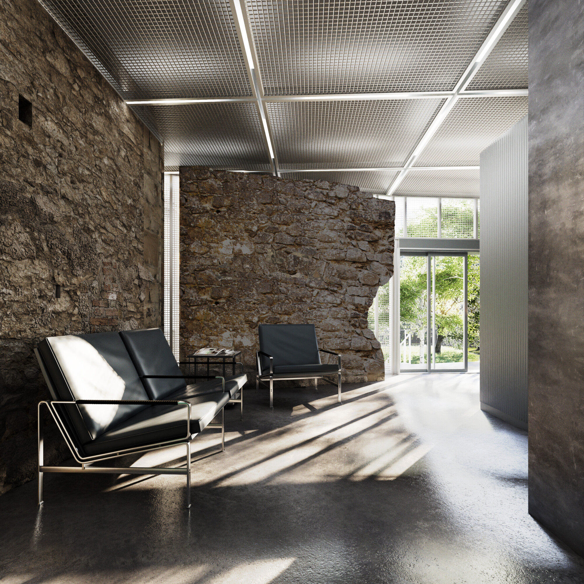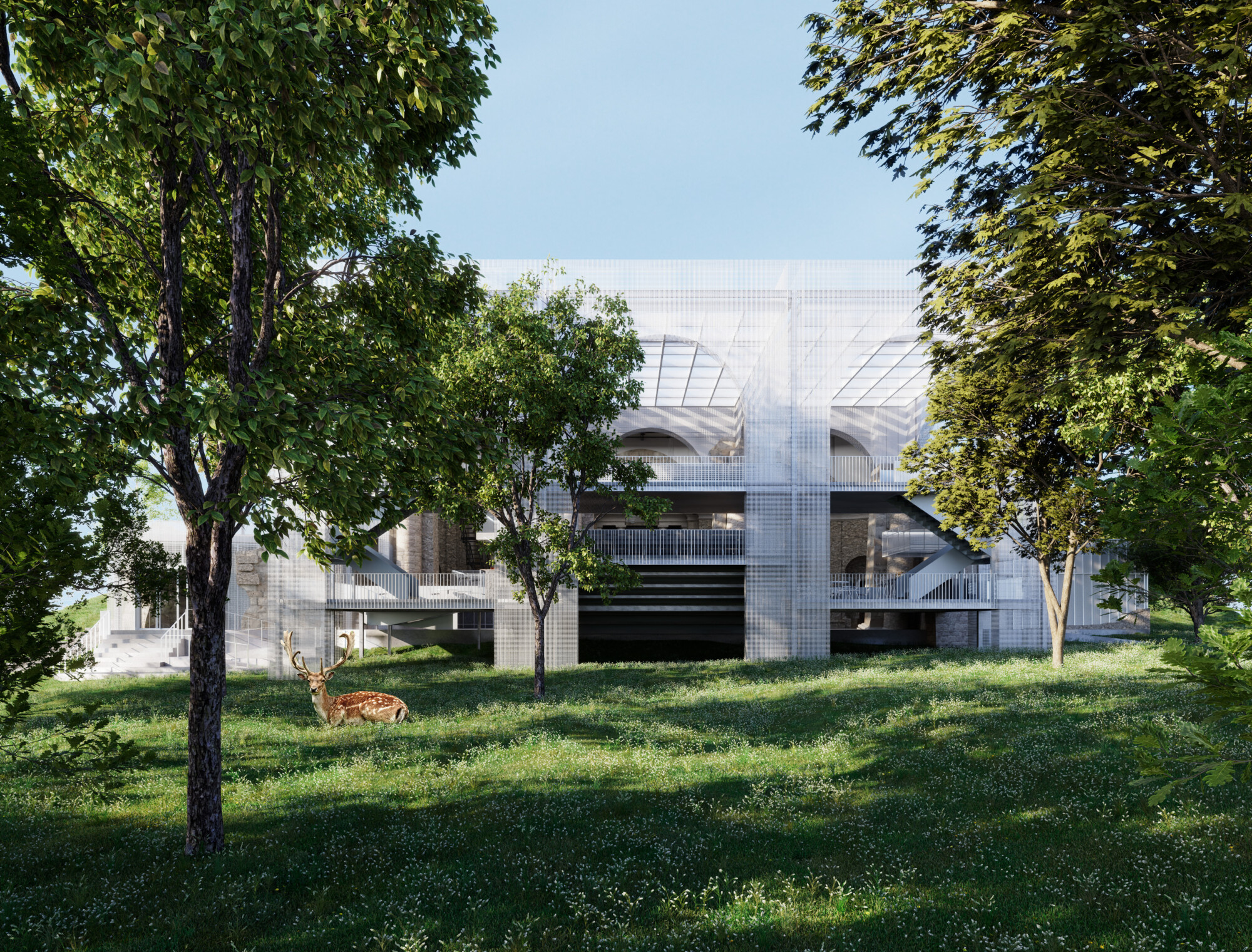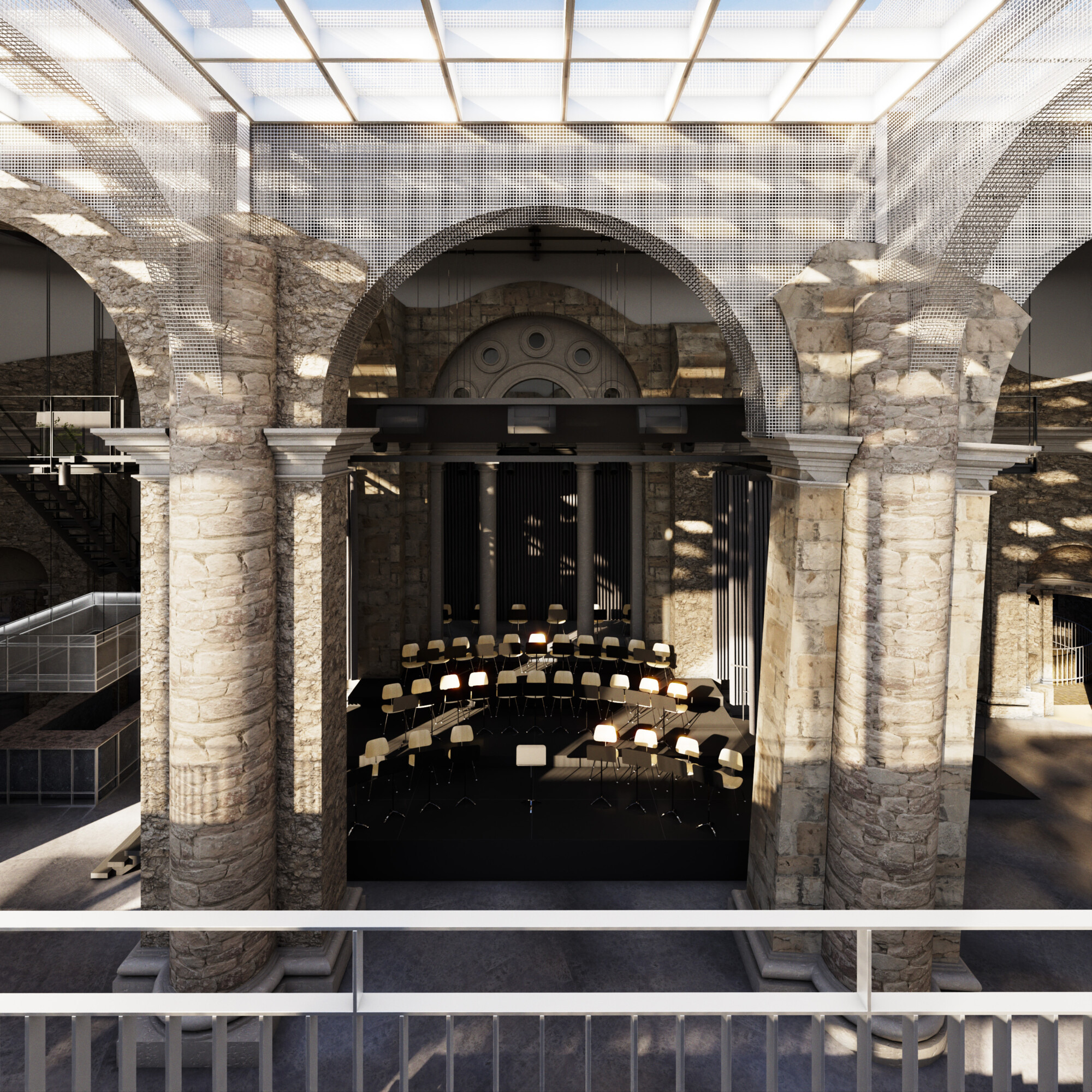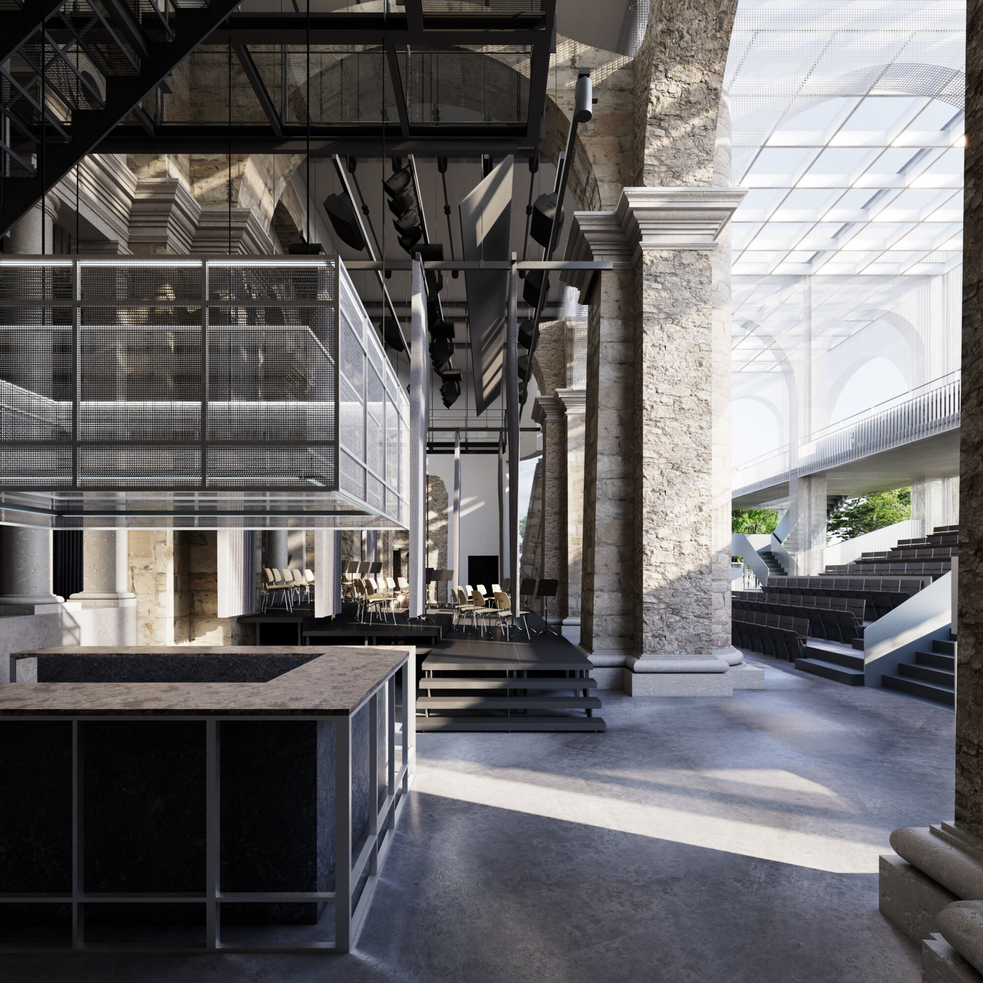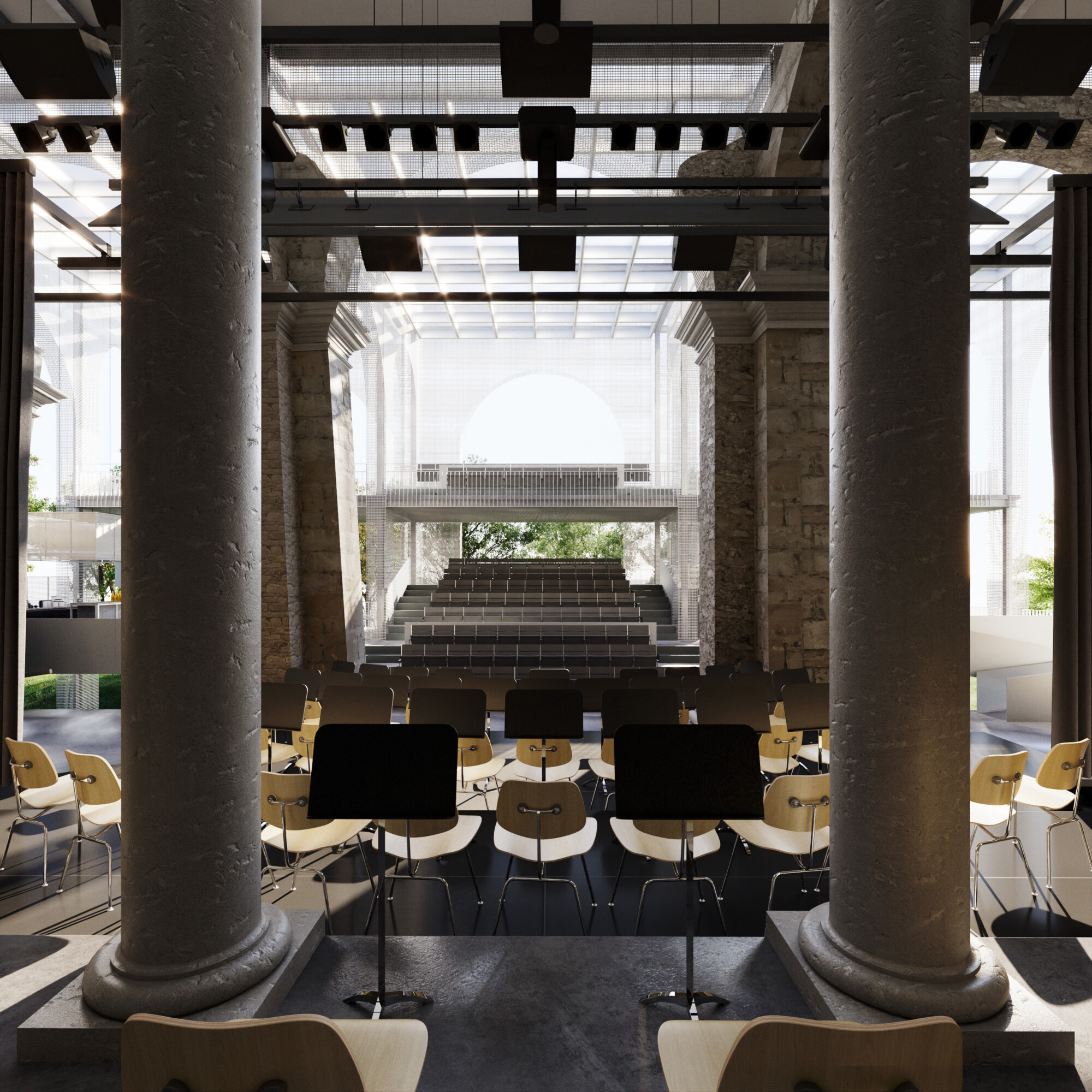 The proposal reimagines the ruins as a semi-enclosed theatre with a semi-seethrough new enclosure, ample seating, cafe areas, balcony and spaces for artists and deliveries.